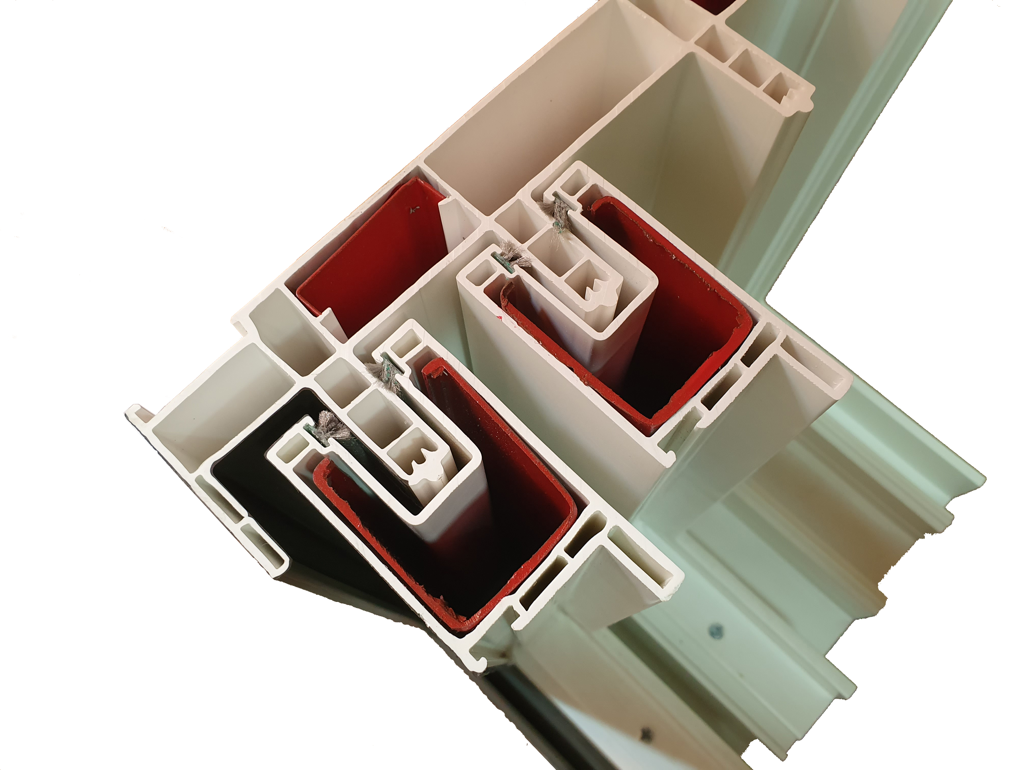 PL창호의 단면(사진1,사진2)입니다. PL창호라고 해서 모든 부재가 PVC 플라스틱으로 만들어지는 것이 아닙니다. 사진1,2에서 보는 것과 같이 PL창호 내부에는 보강재(빨간색)가 존재합니다. 보강재는 창호의 강성을 확보하고 내구성, 내풍압성을 높이기 위해 사용됩니다.