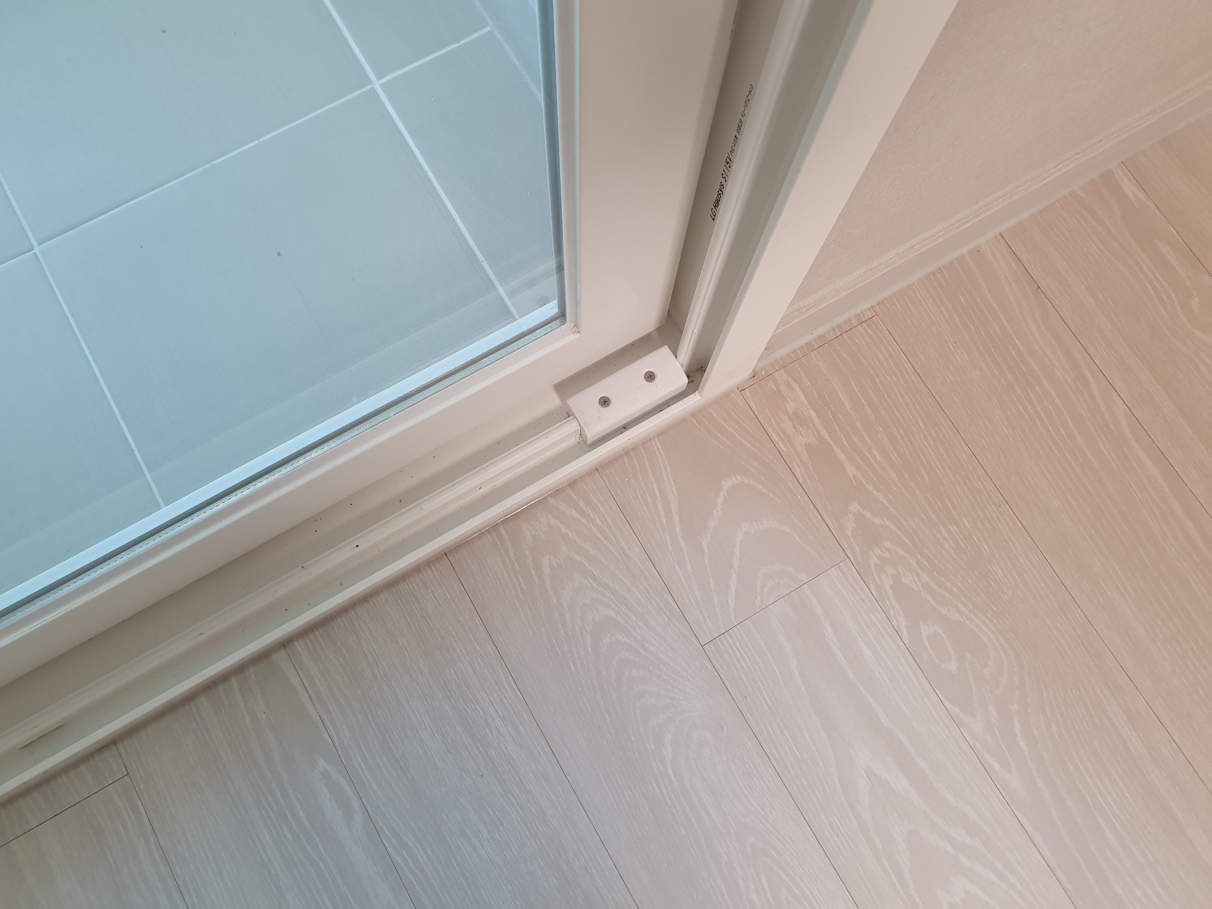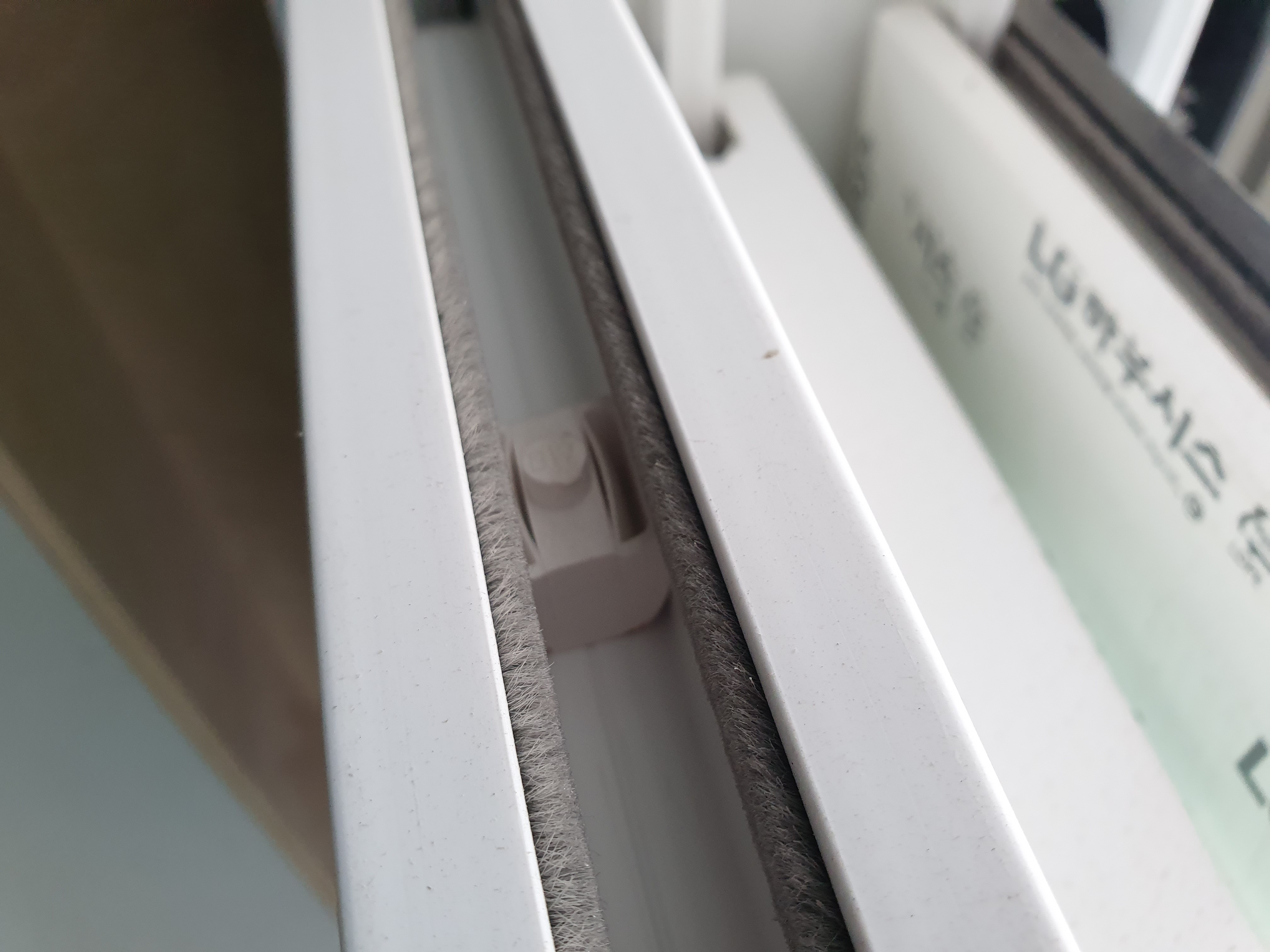 창짝 내부에 위치한 '스페이서(spacer)'입니다. 창호 개폐 시 창호 걸림을 방지하는 역할을 합니다.