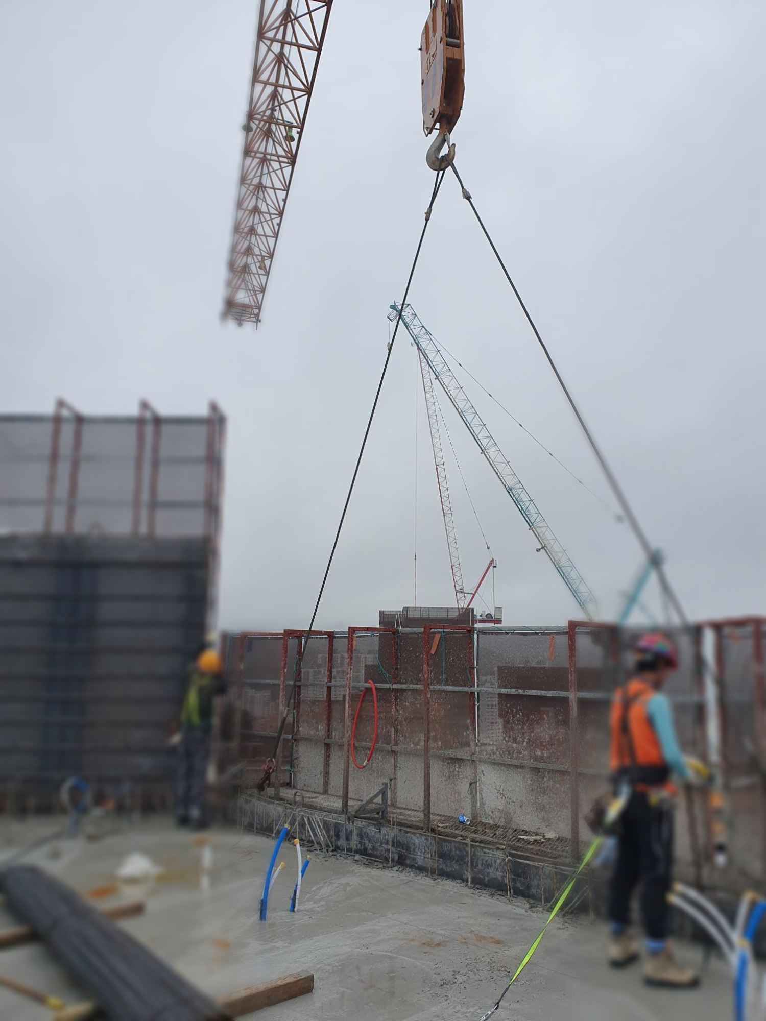 따라서 사진 5처럼 최상단, 최하단 볼트는 고정되어 있는 상태에서 갱폼 인양 고리에 타워크레인 후크를 체결합니다.