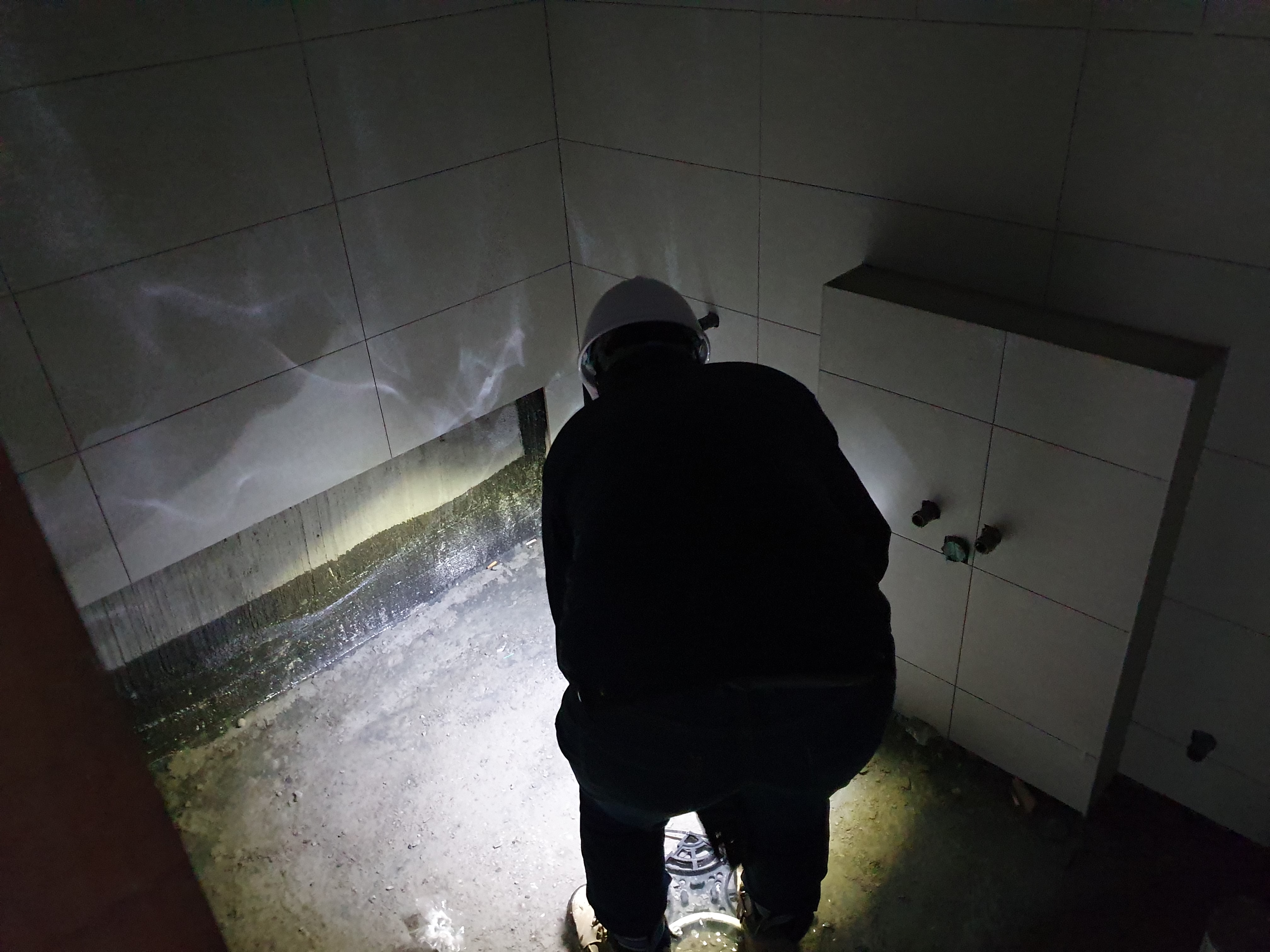 비노출 우레탄도막 방수까지 마무리되었다면, 욕실 방수공정은 끝이 났습니다. 이후 방수층에 문제가 없는지 욕실에 물을 받아 담수테스트(사진6)를 진행합니다. 담수테스트를 통해 누수가 있는 세대가 있는지 확인하고, 만약 있다면 보수공사를 진행하고 다시 담수테스트를 해서 통과 후 다음 공정으로 넘어가게 됩니다.