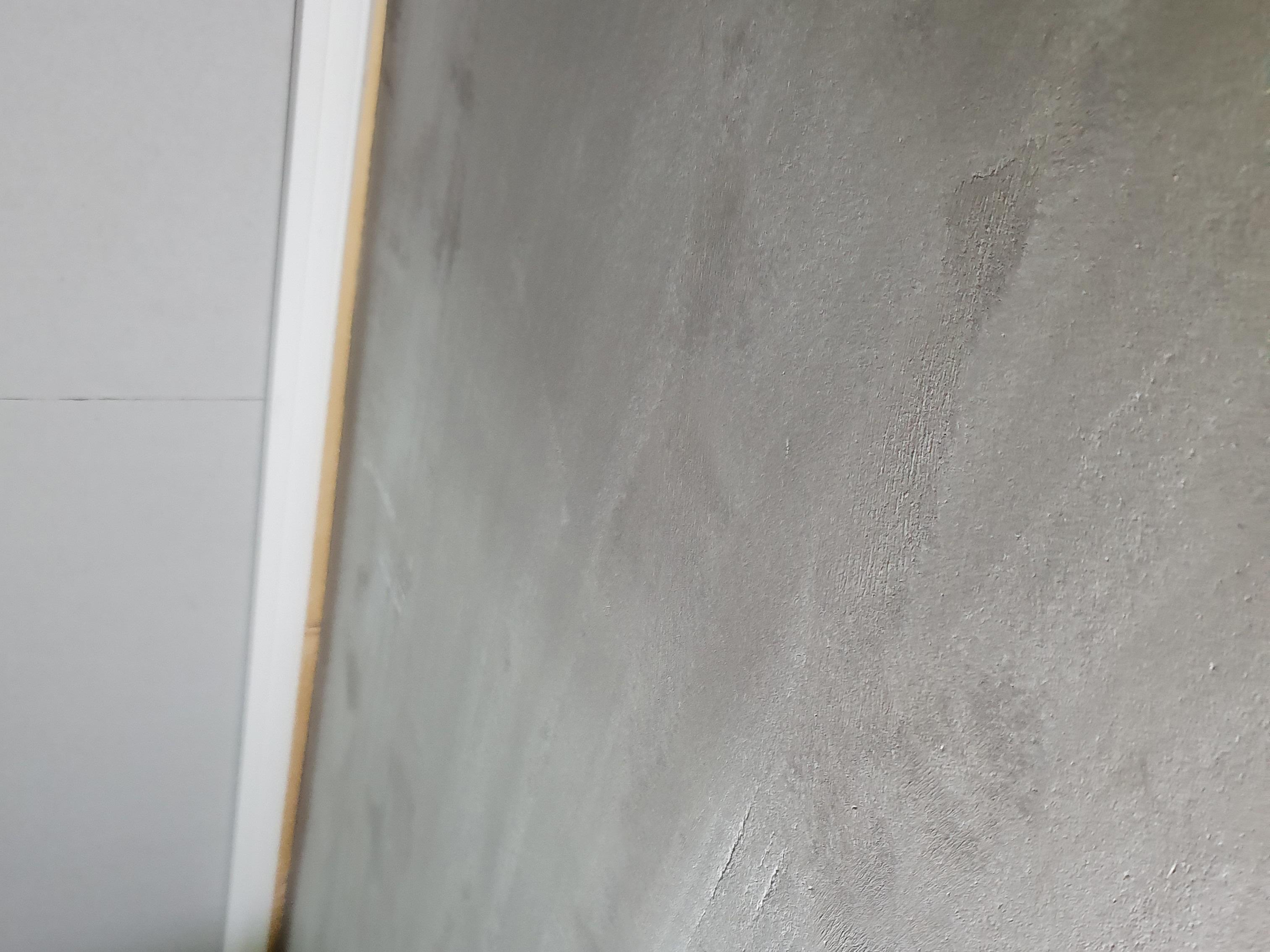 미장공사의 수직, 수평이 제대로 시공되었는지는 몰딩 혹은 걸레받이 같은 부재가 미장면 옆에 시공되면 명확히 알 수 있습니다. 사진7은 미장면의 수평이 맞지 않아 천정몰딩(왼쪽 흰색부재)과 미장면 사이에 틈이 있는 것을 볼 수 있습니다. 이 경우 미장을 추가로 시공해 몰딩사이에 생긴 틈이 보이지 않도록 해야 합니다. 이런 식으로 추가 미장공사를 하게 되면 몰딩이 파손되거나 오염될 수 있는 우려가 발생할 수 도 있기 때문에 한 번에 제대로 된 시공을 하도록 노력하는 것이 중요합니다.