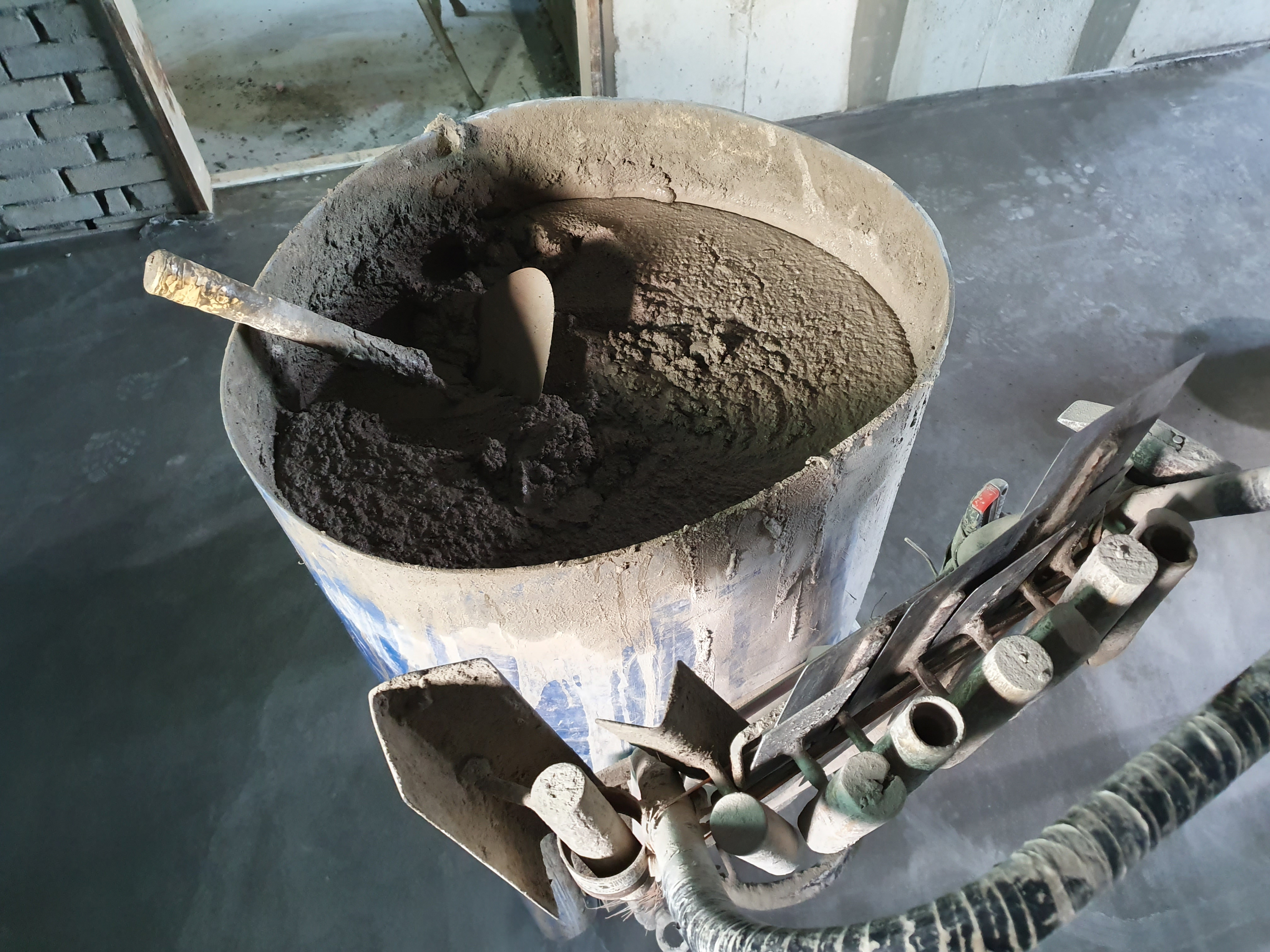 작업 전 미장용 레미탈 1포(40kg)에 물 5~7l 를 혼합하여 작업에 사용할 모르타르를 사진2와 같이 만들어 줍니다. 이때 미장의 품질을 높이기 위해 미장혼화제를 함께 혼합합니다. 미장혼화제는 흰색 가루의 형태인데 메틸셀룰로오스를 주성분으로 하며 균열방지, 작업성 향상, 모르타르 접착력을 증대시키는 역할을 합니다. (미장혼화제의 이름은 제조사마다 다르며 메도몰, 메도칠 등 다양한 제품들이 있습니다. (참고 https://terraco.co.kr/%eb%a9%94%eb%8f%84%ec%b9%a0/)
