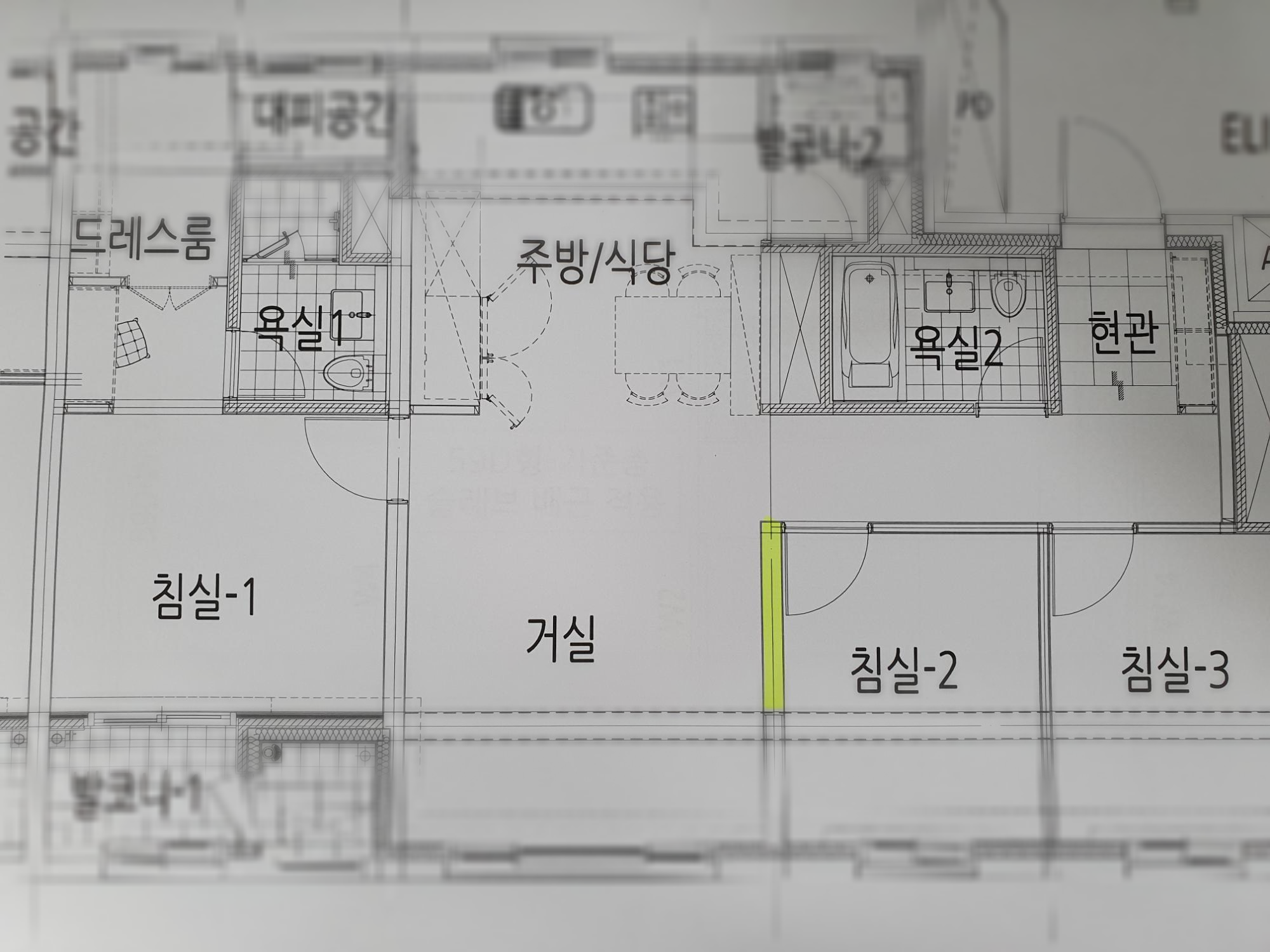 노란색 형광펜으로 색칠한것은 사실은 하나의 벽체이지만, 도면에 따라 표현이 다르게 나타납니다.