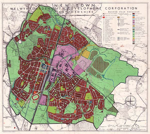 하워드는 실제로 런던에서 기차로 약 1시간 떨어진 곳에 엘원 가든시티를 조성하였습니다. 사진6의 도시 가운데로는 기차가 지나가고 붉은색으로 표시된 곳은 주거지, 핑크색은 공업지역, 이외에도 공공시설, 학교 등이 계획되어 있습니다. 실제로 구글 지도에 Welwyn Garden City(웰륀 가든시티)를 검색하면 런던 북쪽에 위치한 도시를 확인할 수 있으며, 사진6과 거의 유사한 구조를 갖고 있습니다.