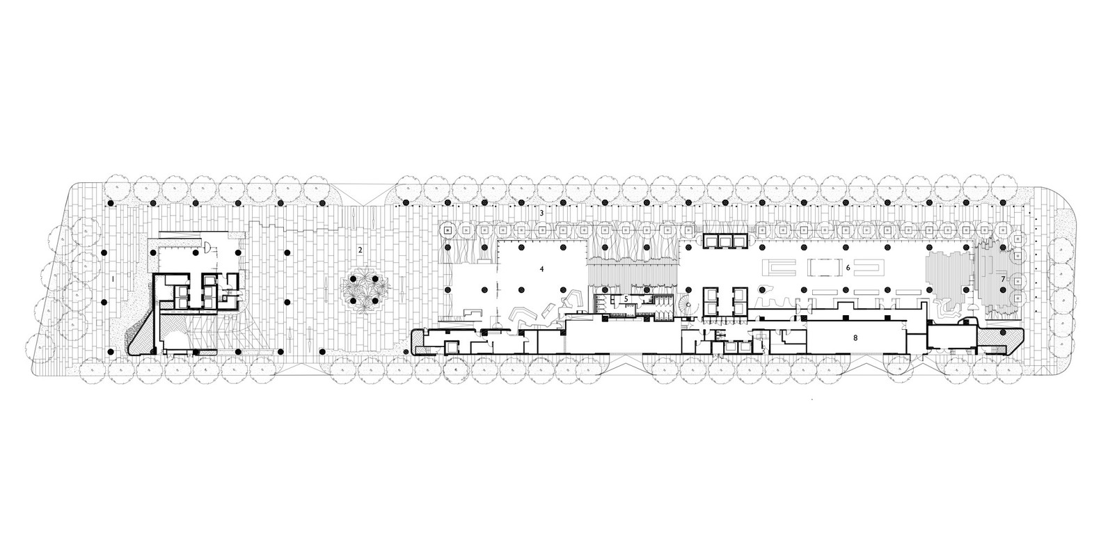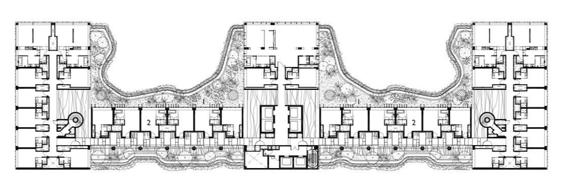 건물의 가진 땅의 외부공간을 극복하기 위해서 어렵게 건축으로 자연을 만들었으며 복도 등 곳곳에도 자연을 배치한 것을 볼 수 있습니다. 이제는 이렇게 어렵게 만든 외부공간(자연)을 몇몇 소수의 객실이 아닌 최대한 많은 객실에 넣어주어야 합니다. 그러려면 건물의 형태는 표면적이 넓은 형태를 가져야 합니다. 따라서 이 건물의 형태(form)는 영어 대문자 'E'처럼 생겼습니다.