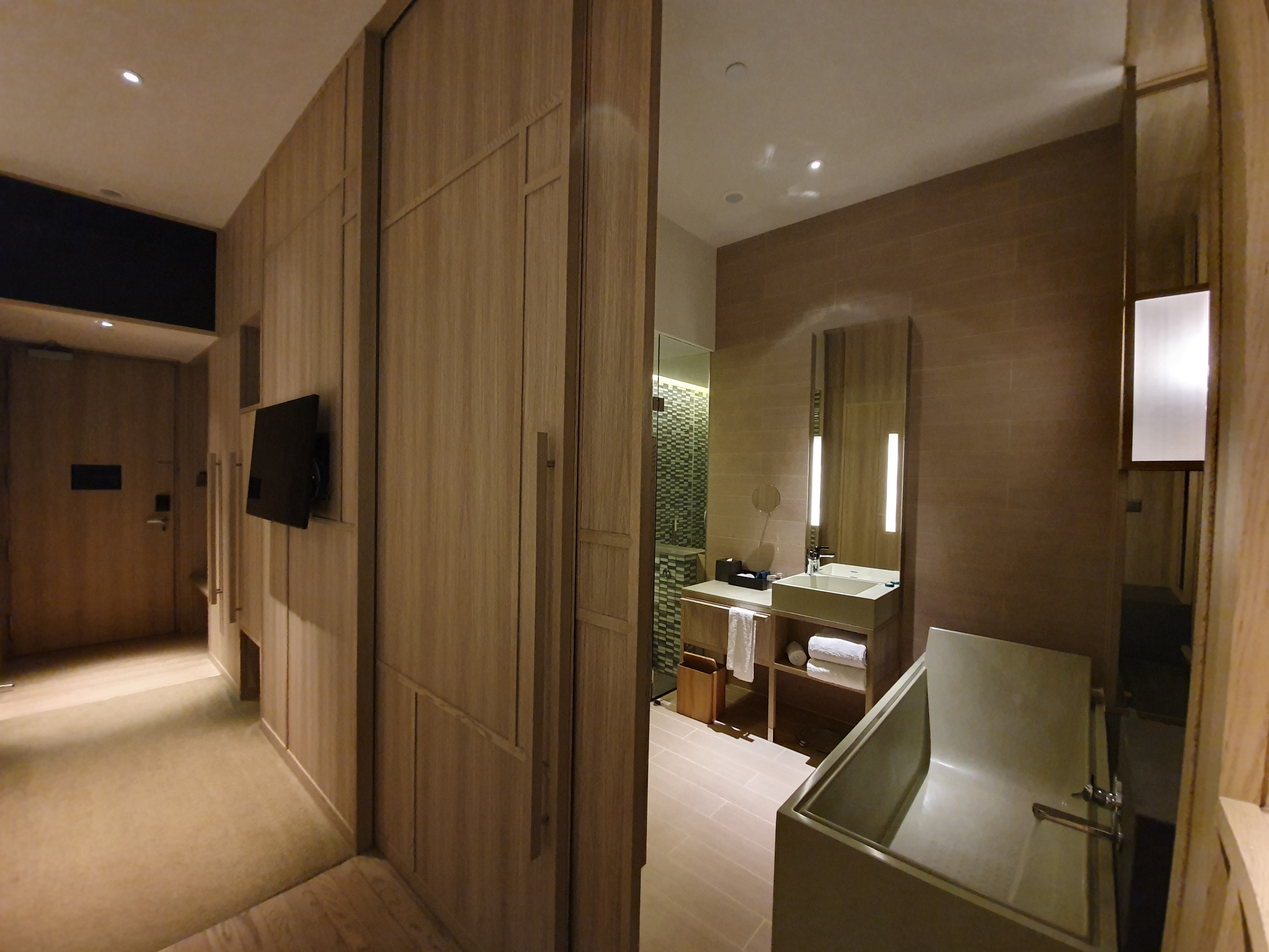 사진 5에서 보듯이 이 땅이 가진 외부공간은 평범한 도시였지만, 외부에 인공적인 자연을 만듦으로 인해서 사진 7과 같은 전망(view)을 갖게 하였습니다. 개인적으로 이 호텔은 도시 속에 있지만 호텔 내부로 들어오면 숲 속에 있는 것 같은 느낌이 들었습니다. 그 이유 중 하나가 객실 내부에서 자연이 보이기도 하지만 객실 내부 마감재를 나뭇결 문양을 가진 마감재를 사용하였습니다. 커튼월의 금속 프레임 역시 나무 문양을 한 겹 더 덧대어 금속 프레임이 보이지 않도록 하였습니다.