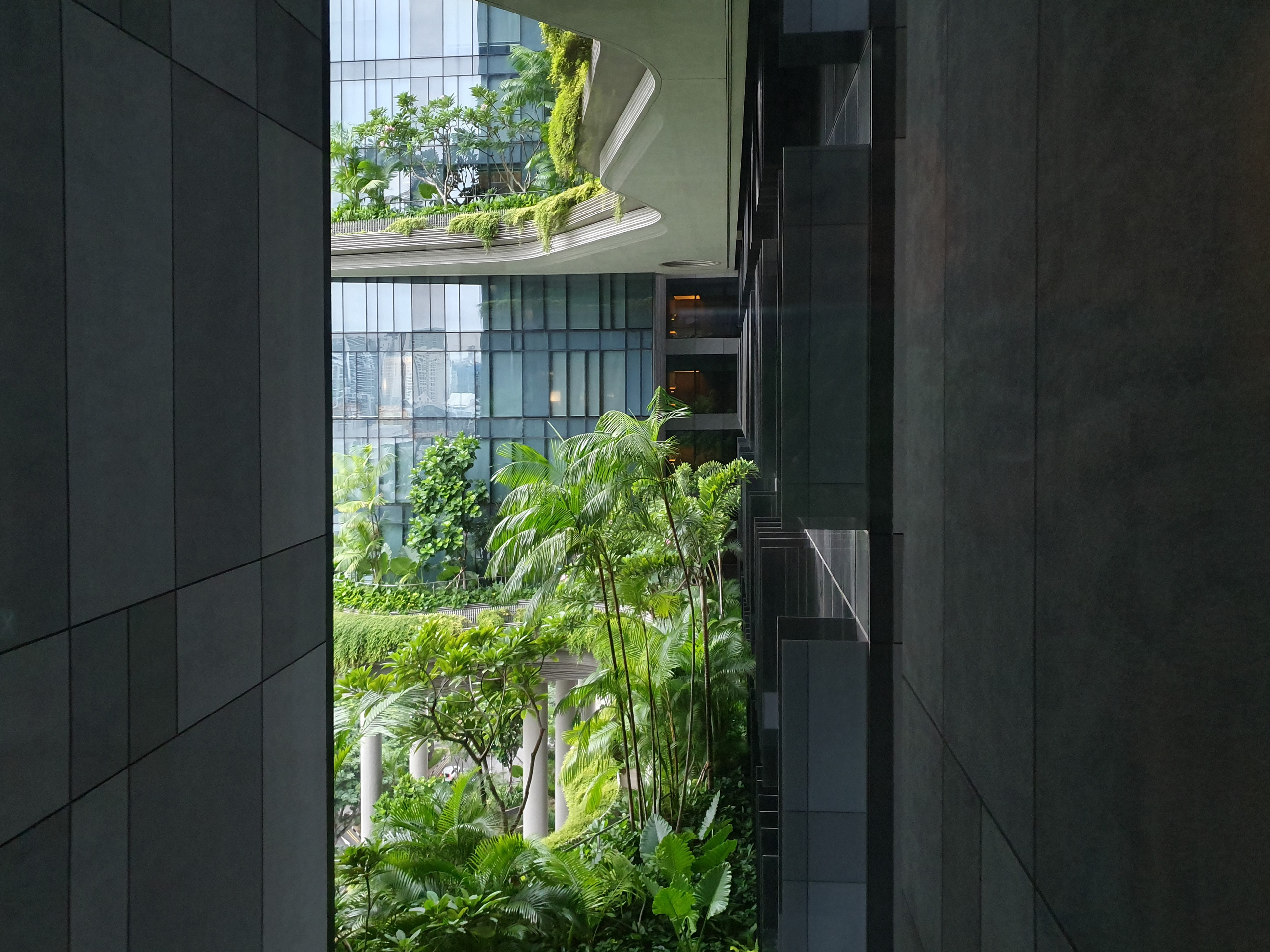 개인적으로 파크로얄 온 피커링 호텔이 자연으로 둘러싸인듯한 독특한 외관을 갖게 된 주요 원인은 객실의 전망(view) 때문이라고 생각됩니다. 위치가 좋다고 하더라도 전망(view)이 별로라면 싱가포르에 다른 호텔과 비교해서 경쟁력이 떨어질 것입니다. 특히 호텔 건축에서는 객실의 크기가 제한적이기 때문에 객실 내부에서 다른 호텔과 차별점을 갖기는 힘듭니다. 그래서 결국에는 좋은 외부공간(view)을 객실 내부로 끌고 들어와야 합니다. 그러나 사진5에서 보듯이 파크로얄 온 피커링 호텔 객실의 전망은 그렇게 좋지 못합니다. 사진6의 마리나 베이 샌즈의 객실 전망 혹은 다른 싱가포르 호텔과 비교해보면 크게 차이가 납니다.