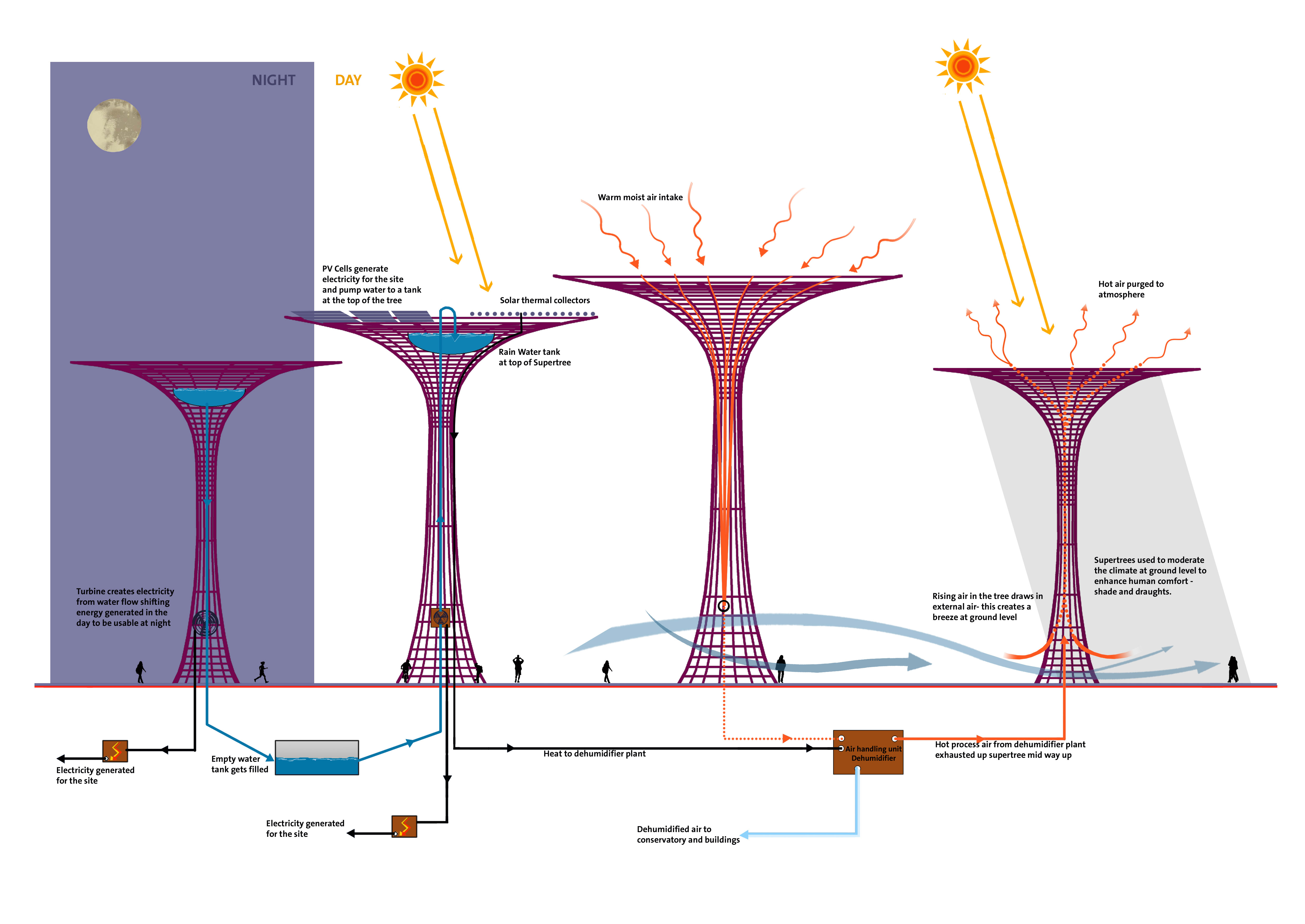 대표적으로 영국 건축사무소 WILKINSON EYRE ARCHITECTS가 디자인한 18개의 슈퍼트리에는 200종이 넘는 162,900개의 식물이 있습니다. 슈퍼트리는 각 종 친환경 설비를 갖추고 있어 친환경에너지를 생산, 활용하고 있습니다. 또한 슈퍼트리의 캐노피는 낮에 식물원을 방문한 사람들에게 시원한 그늘을 제공하기도 합니다. 밤에는 슈퍼트리에 설치해둔 빛과 음악을 이용해 '가든스 랩소디'라는 쇼를 진행합니다.