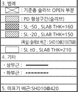 [3. 범례]를 보면 사각형안에 다양한 해치 무늬들이 있는 것을 볼 수 있습니다. 예를 들어 빈칸으로 된 사각형은 : SL+0, SLAB THK=210인데, 대각선 해치 무늬 사각형은 SL-50, SLAB THK=160이라고 적혀있는 것을 볼 수 있습니다. 말 그대로 대각선 해치 무늬가 표시된 구간은 슬래브 레벨이 50mm 낮은 160mm라는 뜻입니다. 그러면 슬래브 철근 배근을 할 때 210mm 슬래브와 똑같이 높이로 배근하는 것이 아니라 더 낮게 시공되어야 합니다. (욕실 구간이라 슬래브 레벨이 조금 더 낮습니다. 욕실은 물을 사용하기 때문에 방보다는 레벨이 낮아야 하고, 욕실화를 넣어두고도 화장실 문이 닫혀야 하기 때문에 50mm를 낮게 시공하는 것입니다.)
