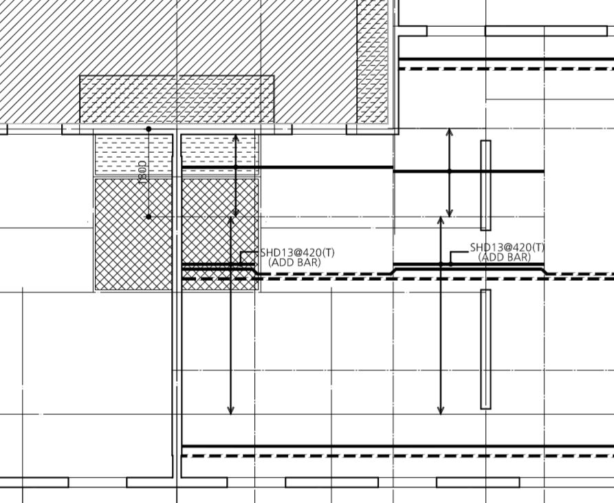 [5.미표기 배근] : SHD10@420이라는 의미는 사진 3과 사진 4에 'SHD13@420(T) (ADD BAR)'이라고 표시된 것 외에 실선, 점선은 모두 10mm 철근은 420mm 간격으로 배근한다는 뜻입니다.